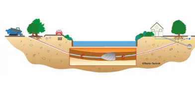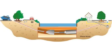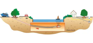 ausheben zu müssen. Die Horizontalspülbohranlage bohrt zwischen zwei Gruben einen